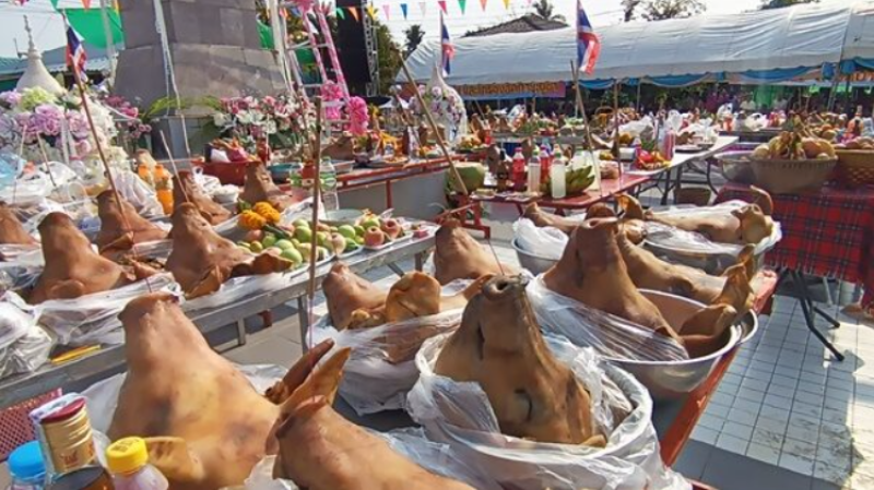 โดยเฉพาะหัวหมูที่นำมาเซ่นไหว้ มีมากถึง 150 หัวเลยทีเดียว และหลังจากประกอบพิธีบวงสรวง นายอำเภอเสิงสางได้จุดประทัดเฉลิมฉลอง และมีการประกาศเลขปลายประทัดให้ผู้ที่มาร่วมในงานได้ทราบ ได้แก่ เลข 274, 835, 68 และ 45