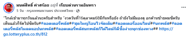 ใกล้เข้ามาเเล้วสำหรับผลรางวัลสลากกินแบ่งรัฐบาล งวดวันที่ 16 ตุลาคม 2568 ล่าสุดนักร้องลูกทุ่ง มนต์สิทธิ์ คำสร้อย ได้โพสต์ภาพตนเองด้วยการชี้เป้าไปที่ตัวเลขบนเสื้อที่เขาสวมใส่อยู่ พร้อมแคปชั่นว่า