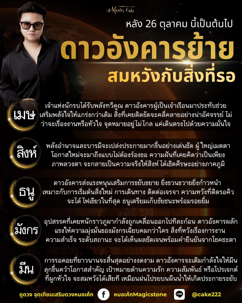 วันที่ 27 ต.ค ทาง หมอเค้กดลบันดาล เผย 5 ชะตาราศี หลัง 26 ตุลาคมนี้เป็นต้นไป ดาวอังคารย้าย สมหวังกับสิ่งที่รอ ราศีใดได้รับพลังทวีคูณ ราศีใดสมหวัง ประกอบด้วย ราศีเมษ ราศีสิงห์ ราศีธนู ราศีมังกร และ ราศีมีน โดยมีรายละเอียดของแต่ละราศีนี้