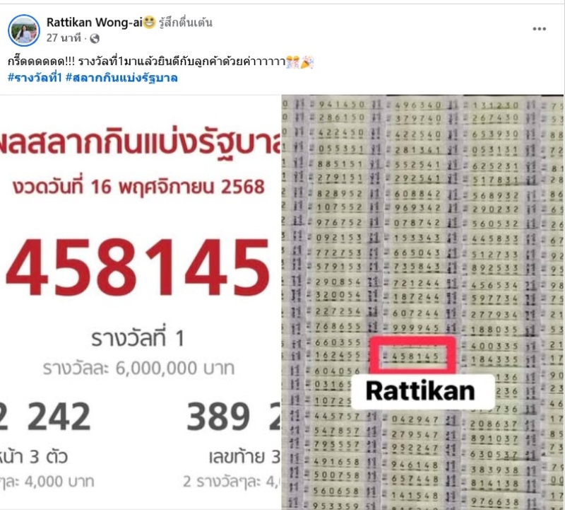 ล่าสุด ทางfacebook คุณRattikan Wong-ai ได้ออกมาโพสต์ว่า กรี๊ดดดดดด!!! รางวัลที่1มาแล้วยินดีกับลูกค้าด้วยค่าาาาาา #รางวัลที่1 #สลากกินแบ่งรัฐบาล