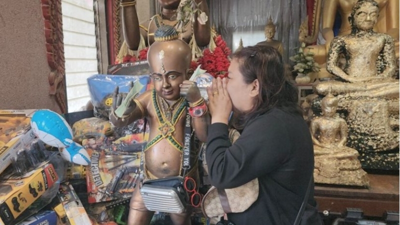 ขณะเดียวกันที่บริเวณกุมารทองน้องเก้าเลิฟเลิฟ 30 ล้าน ยังมีนักเสี่ยงโชคเดินทางมากราบขอพรกันจำนวนมาก เทคนิคในการขอพรของกุมารทองน้องเก้า love love ต้องทำการกระซิบข้างหู หลายคนขอพรสำเร็จแล้วจะนำสิ่งของมาแก้บน ไม่ว่าจะเป็นน้ำแดง ของเล่น รถแข่ง รถบังคับ ที่วางเรียงรายล้อมรอบตัวของกุมารทองน้องเก้า เลิฟ เลิฟ 30 ล้าน