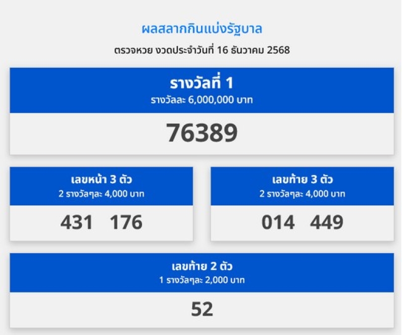 ออกไปเป็นทีเรียบร้อยแล้ว สำหรับการประกาศผลรางวัลสลากกินแบ่งรัฐบาล ประจำวันทรา 16 ธันวาคม 2568 โดยผลรางวัลได้แก่ รางวัลที่ 1 รางวัลละ 6,000,000 บาท 763895 เลขท้าย 2 ตัว 1 รางวัลๆละ 2,000 บาท 52