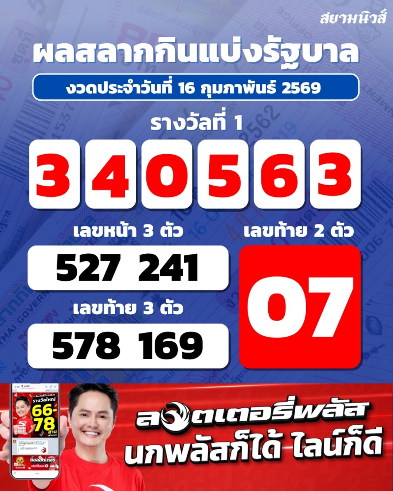 ประกาศออกไปเป็นที่เรียบร้อยแล้ว สำหรับการประกาศผลรางวัลสลากกินแบ่งรัฐบาล ประจำวันที่ 16 กุมภาพันธ์ 2569 โดยมีรางวัลสำคัญดังนี้ รางวัลที่ 1 รางวัลละ 6,000,000 บาท 340563 เลขหน้า 3 ตัว 2 รางวัลๆละ 4,000 บาท 527 241 เลขท้าย 3 ตัว 2 รางวัลๆละ 4,000 บาท 578 169 เลขท้าย 2 ตัว 1 รางวัลๆละ 2,000 บาท 07