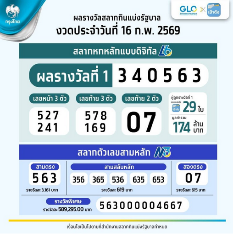 ล่าสุด Krungthai Care รายงานผลสลากดิจิทัล งวดประจำวันที่ 16 ก.พ. 69 รางวัลที่ 1 เลขที่ 340563 จำนวนใบที่ถูกทั้งหมด 29 ใบ รวมเป็นเงินรางวัล 174 ล้านบาท ถูก 1 ใบ จำนวน 9 คน ถูก 20 ใบ จำนวน 1 คน