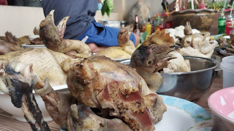 นายบุญมา นารี อายุ 69 ปี ปราชญ์ชาวบ้าน กล่าวว่า ทุก ๆ ปี ชาวหมู่บ้านของเราจะมีการนำไก่และของหวานของคาวประกอบกับสุราเครื่องดื่มนำมาเซ่นไหว้ศาลเจ้าปู่ตา ซึ่งเรานำมาปฏิบัติทุกๆปีและปีนี้ได้มีชาวบ้านจำนวน 68 ครัวเรือนได้นำไก่มาเซ่นไหว้จำนวน 68 ตัว ไข่จำนวน 5 ฟอง