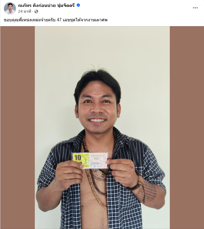 ล่าสุด ทาง คิงก่อนบ่าย หรือ ณภัทร ชุ่มจิตตรี ได้ออกมาโพสต์ผ่านfacebook ณภัทร คิงก่อนบ่าย ชุ่มจิตตรี โดยได้ระบุแคปชั่นว่า ขอบคุณพี่เหน่งเหม่งจ๋ายครับ 47 เลขชุดได้จากงานเผาศพ และยังไปคอมเมนต์ใต้โพสต์ บอล เชิญยิ้ม ว่า 10 ใบครับ
