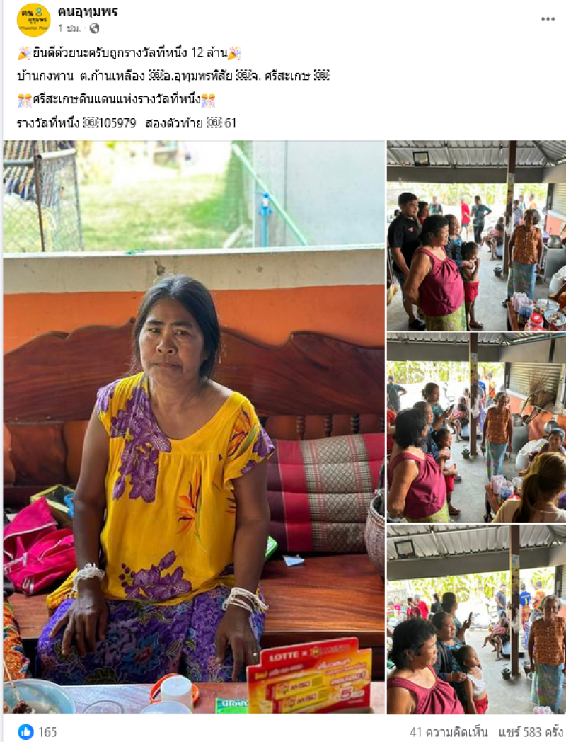ล่าสุด เพจ ฅนอุทุมพร ได้ออกมาโพสต์คนถูกรางวัล โดยระบุว่า ยินดีด้วยนะครับถูกรางวัลที่หนึ่ง 12 ล้าน บ้านกงพาน ต.ก้านเหลือง อ.อุทุมพรพิสัย จ. ศรีสะเกษ ศรีสะเกษดินแดนแห่งรางวัลที่หนึ่ง รางวัลที่หนึ่ง 105979 สองตัวท้าย 61
