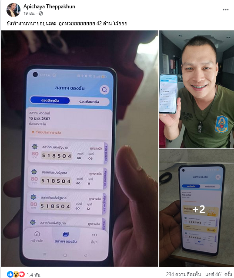 ล่าสุดเฟสบุ๊ค Apichaya Theppakhun ได้ออกมาโพสต์คนถูกรางวัลที่ 1 โดยระบุว่า ยังทำงานทนายอยู่นะคะ ถูกหวยยยยยยยย 42 ล้าน โว้ยยย