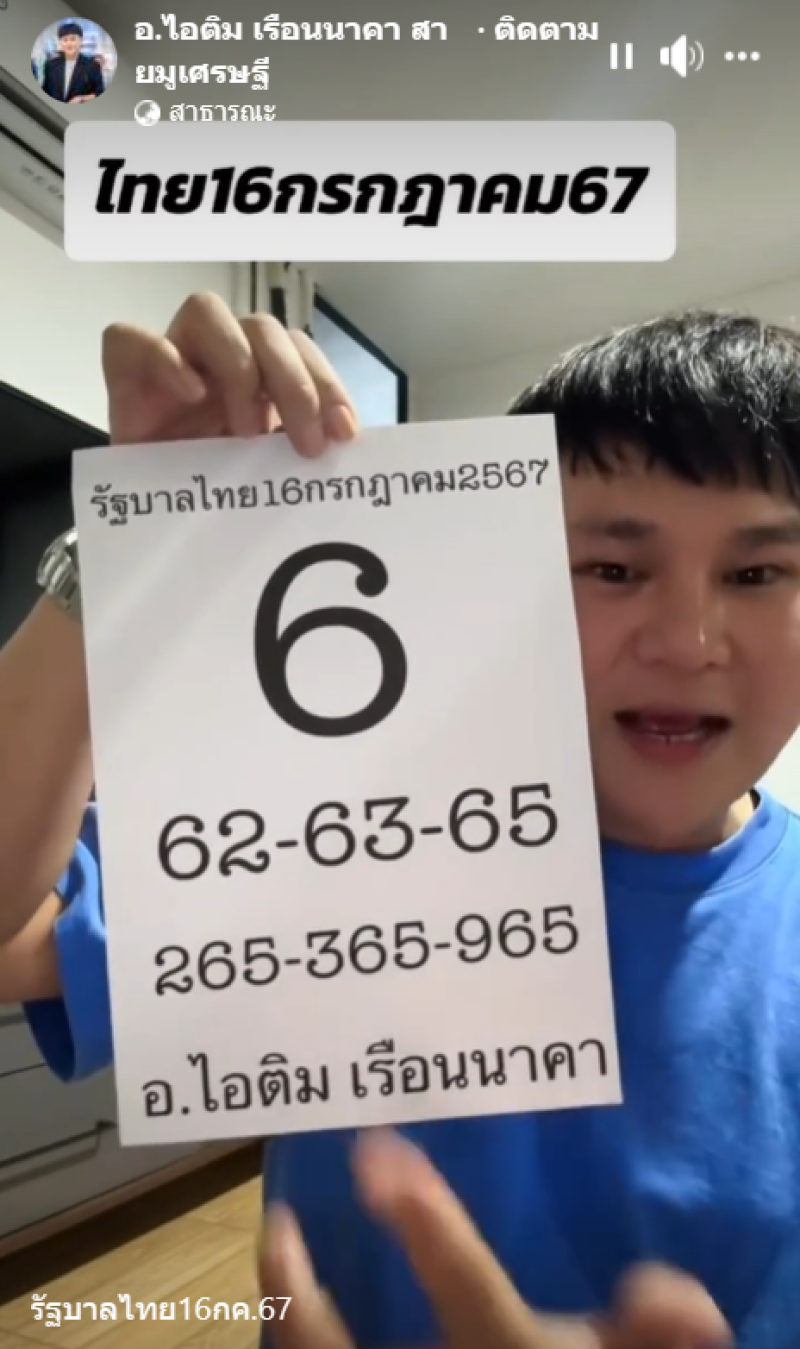 โดยทาง อ.ไอติม ได้เผยคลิป ระบุแคปชั่นว่า รัฐบาลไทย 16 ก.ค. 67 ซึ่งในคลิปได้พูดว่า ถ้างวดนี้เลขพวกนี้ไม่เข้า จะเอาตัวเองไปอาบทาสีบ้าน ทำเอาแฟนๆฮือฮามาก และเลขที่ปรากฏขึ้นนั้นคือ 6 - 62 - 63 - 65 - 265 - 365 - 965