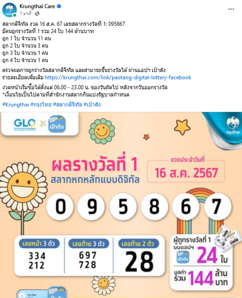 ล่าสุดเพจ Krungthai Care ได้ออกมาโพสต์ระบุว่า สลากดิจิทัล งวด 16 ส.ค. 67