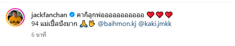 ล่าสุด แจ็คได้โพสต์ พร้อมระบุแคปชั่นว่า คากิลูกพ่อออออออออออ 94 แม่เปิ้ลปังมาก @baihmon.kj @kaki.jmkk