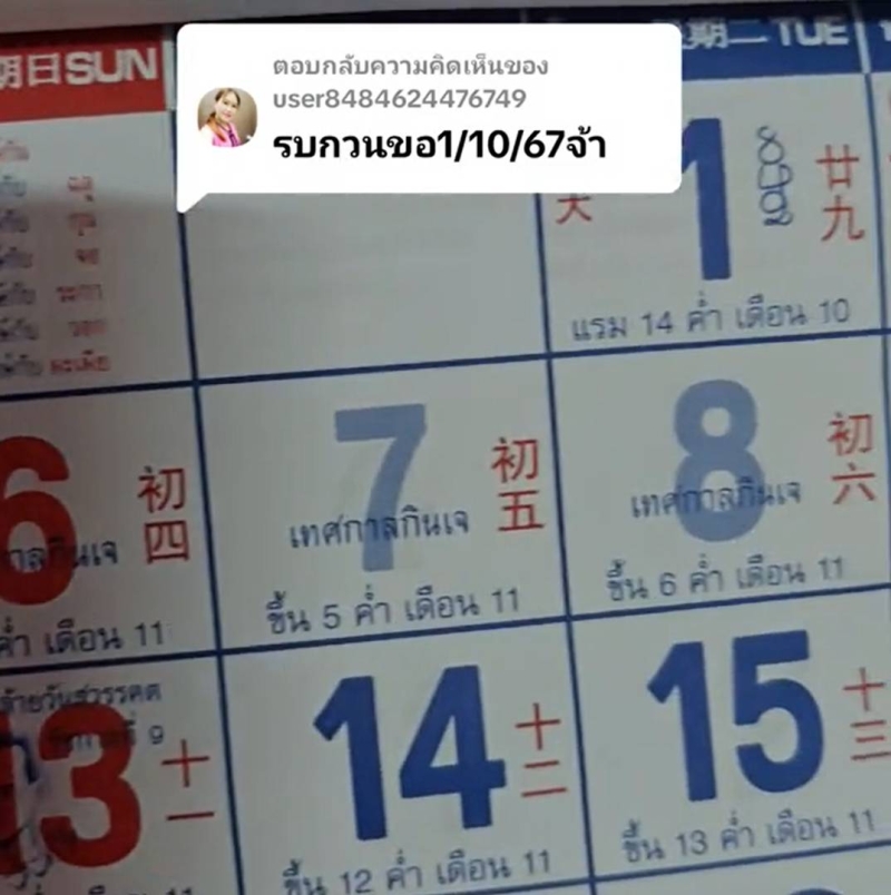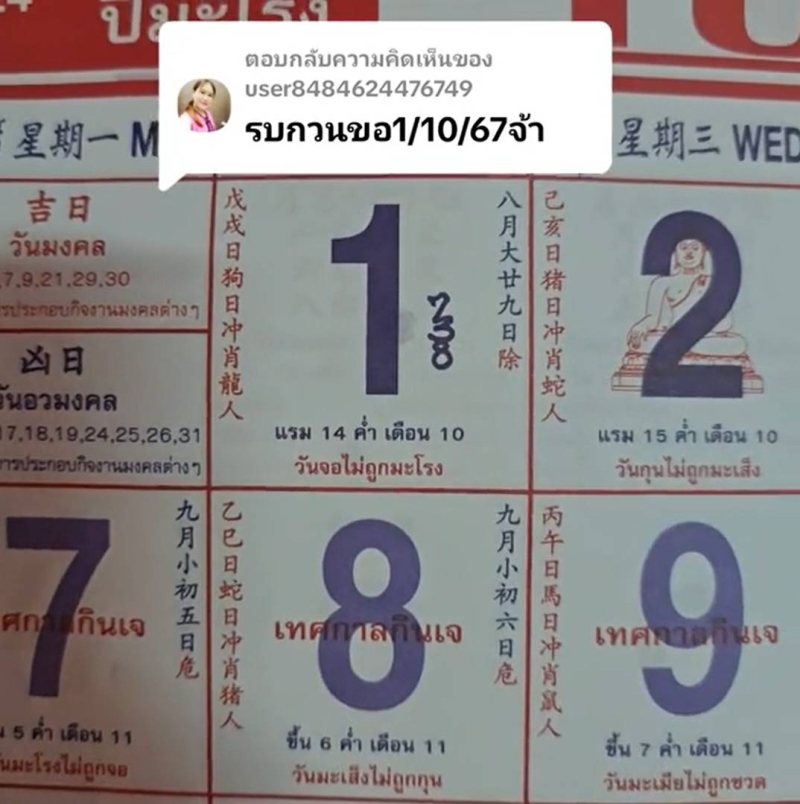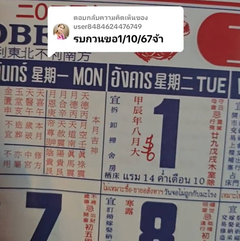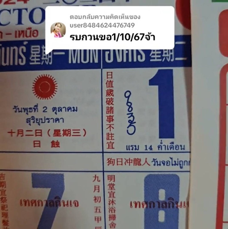 เลขปฏิทินจีน 1 ตุลาคม 2567