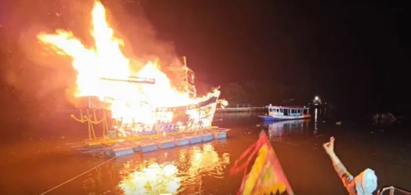 พิธีเผาเรือสำเภาและเครื่องบูชาต่างๆ เช่น หีบเงินหีบทอง ดอกบัว โคมไฟ กระดาษเงินกระดาษทอง และประทัดจำนวนมาก ถูกจัดขึ้นกลางคลองแม่กลอง เพื่อส่งเทพเจ้ากิ้วอ๊วงฮุกโจ้วกลับสู่สวรรค์ตามความเชื่อ เป็นการสิ้นสุดเทศกาลถือศีลกินเจประจำปี 2567 อย่างสมบูรณ์