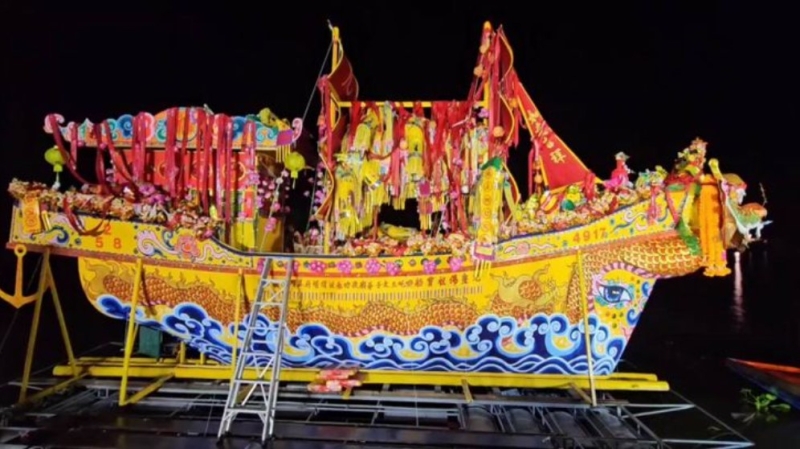 ในเวลา 23.29 น. หลังจากเสร็จสิ้นการสวดมนต์ ผู้เข้าร่วมพิธีได้ทำการปล่อยเรือสำเภาประทับเทพเจ้าที่ใหญ่ที่สุดในประเทศไทย ซึ่งสร้างขึ้นเหมือนเรือสำเภาจริง มีขนาดกว้าง 3 เมตร ยาว 10 เมตร สูง 6 เมตร มูลค่ากว่า 200,000 บาท ตัวเรือตกแต่งเป็นลวดลายมังกร ซึ่งปีนี้ถือเป็นปีพิเศษเนื่องจากเป็นปีมังกรทอง โดยหัวเรือเป็นรูปมังกร 5 เล็บ ซึ่งถือเป็นมังกรพิเศษ ใครที่มากราบไหว้จะสมความปรารถนาทุกประการ