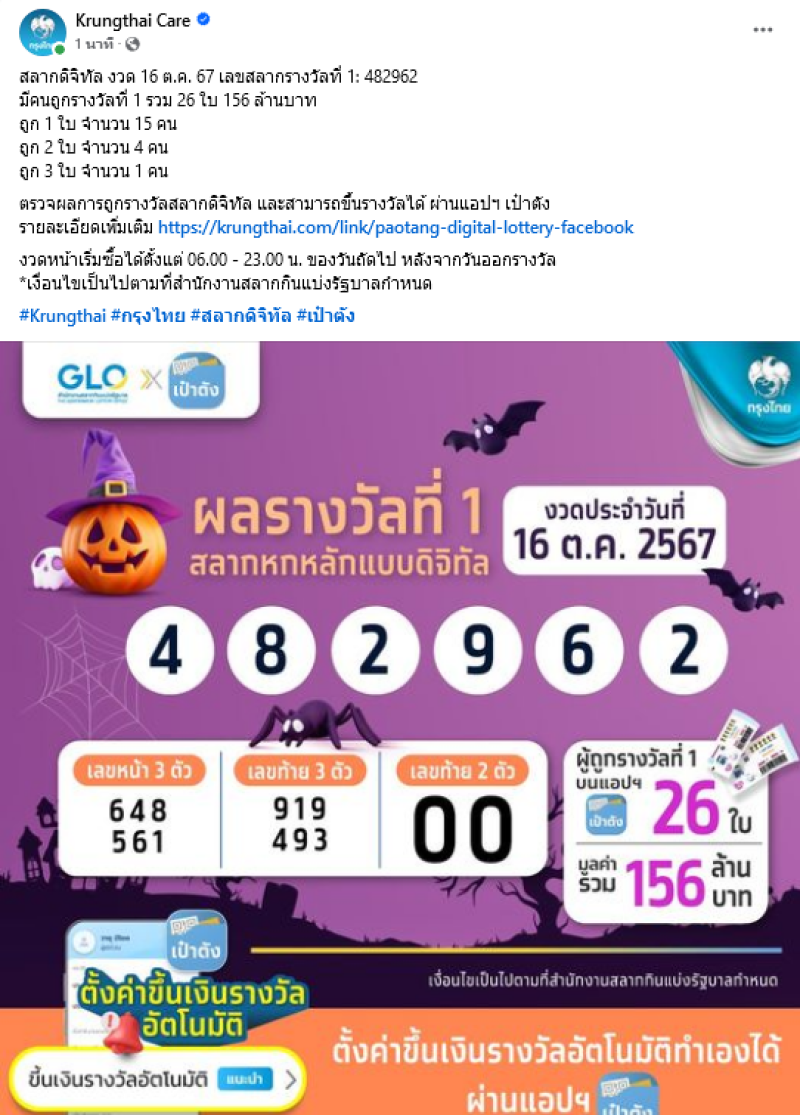 ล่าสุด Krungthai Care ได้ออกมาโพสต์รางวัล โดยระบุว่า