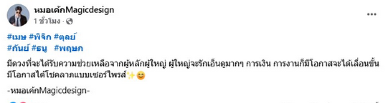 หมอเค้ก Magicdesign ได้ออกมาทำนายดวงชาวราศี “เมษ พิจิก ตุลย์ กันย์ ธนู พฤษภ”ว่ามีดวงได้จะได้รับการช่วยเหลือจากผู้ใหญ่ ที่สำคัญกำลังจะมีโชคในเรื่องของการเงิน การงาน โดย หมอเค้ก ทำนายว่า “#เมษ #พิจิก #ตุลย์ #กันย์ #ธนู #พฤษภ มีดวงที่จะได้รับความช่วยเหลือจากผู้หลักผู้ใหญ่ ผู้ใหญ่จะรักเอ็นดูมากๆ การเงิน การงานก็มีโอกาสจะได้เลื่อนขั้น มีโอกาสได้โชคลาภแบบเซอร์ไพรส์