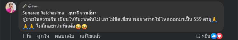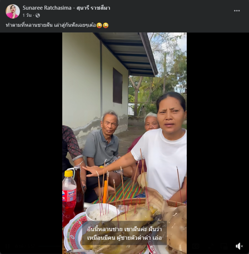 ล่าสุดสุนารี ราชสีมา ได้เล่าความฝันของหลานที่มีคนมาบอกกล่าวในฝันอยากกินหัวหมู โดยในคลิปภาพเป็นการจุดธูปเซ่นไหว้ พร้อมกับได้เขียนข้อความไว้ว่า ทำตามที่หลานชายฝัน เล่าสู่กันฟังเฉยๆ เด้อ ทั้งนี้ยังคอมเมนต์เพิ่มเติมใต้คลิปอีกว่า ผู้ชายในความฝัน เขียนให้กับรากต้นไม้ เอาไม้ขีดเขียน พอยางรากไม้ไหลออกมาเป็น 559 สาธุไม่ถืกอย่าว่ากันเด้อ