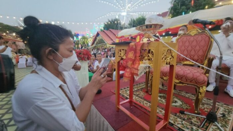 หลังเสร็จสิ้นพิธีเจริญพระพุทธมนต์ หลวงพี่น้ำฝนเชิญนายสมชาติ สาลีพัฒนา เจ้าของร้านก๋วยเตี๋ยวลูกชิ้นปลานายเงี๊ยบ คุณเบญจวรรณ ริทเทอร์ ผู้อุปถัมภ์วัดไผ่ล้อม เป็นประธานฝ่ายฆราวาส นำผ้าแพรและพวงมาลัยคล้อง พร้อมปิดทองช่อฟ้า เป็นการประเดิม