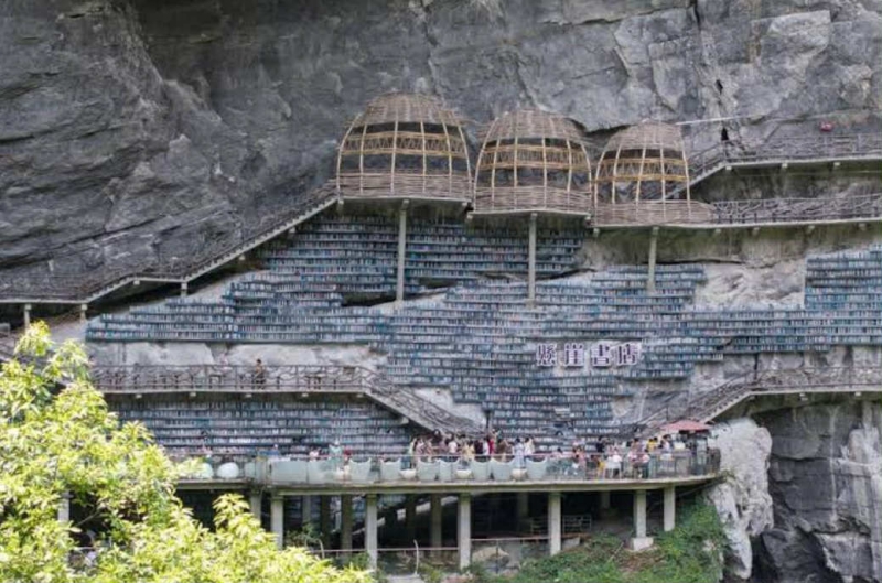 ทางเข้าห้องสมุด ได้สร้างความประทับใจตั้งแต่แรกพบ ด้วยทางเดินไม้ และระเบียงที่ยื่นออกไปจากหน้าผา ในขณะที่ภายในห้องสมุด ตั้งอยู่ในถ้ำขนาดใหญ่ มีหนังสือมากมาย ที่จัดเรียงตามผนังที่ไม่เรียบ เป็นการผสมผสานระหว่างธรรมชาติ และความรู้ได้อย่างลงตัว