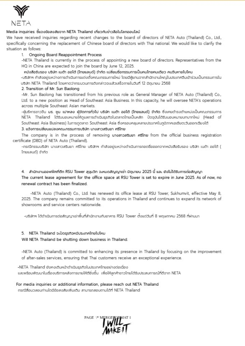วันที่ 29 พ.ค. 68 บริษัท เนต้า ออโต้ (ไทยแลนด์) จำกัด NETA ออกหนังสือแถลงการณ์เพื่อชี้แจงกรณีข่าวลือในโซเชียลเกี่ยวกับความชัดเจนของการดำเนินธุรกิจในประเทศไทย โดยมีรายละเอียดดังนี้