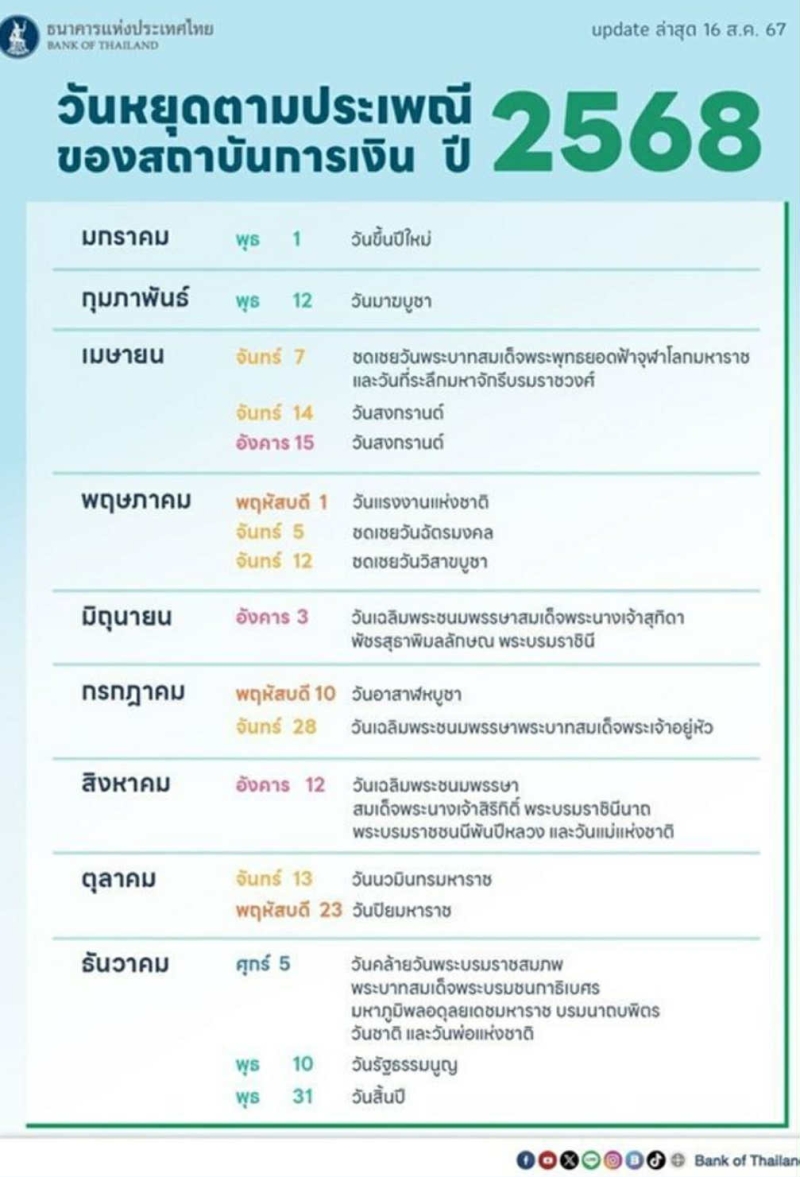 โดย มีประกาศจากธนาคารแห่งประเทศไทย (ธปท.) เกี่ยวกับวันหยุดธนาคารตามประเพณีในปี 2568