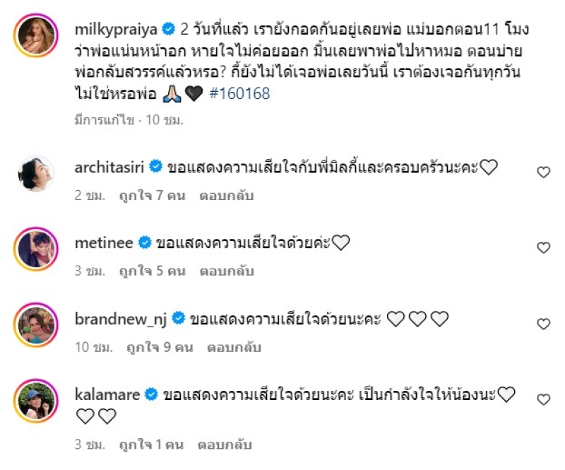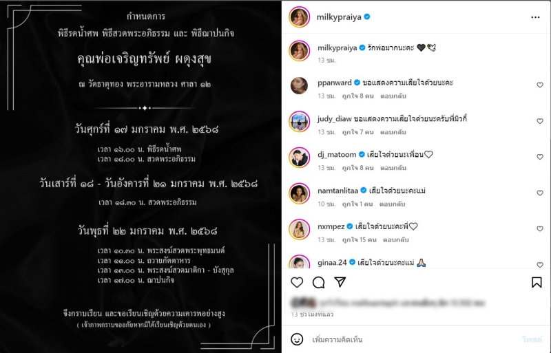 เรียดได้ว่า เป็น นักเเสดง/ อินฟลูสุดแซ่บ อย่าง มิวกี้ ไปรยา ที่ได้ออกมาประกาศข่าวเศร้าคุณพ่อได้จากไปแล้วผ่านทางอินสตาแกรมว่า รักพ่อมากนะคะ พร้อมแจ้งพิธีสวดอภิธรรม และต่ามา มิวกี้ ได้โพสต์ว่า 2 วันที่แล้ว เรายังกอดกันอยู่เลยพ่อ แม่บอกตอน11 โมงว่าพ่อแน่นหน้าอก หายใจไม่ค่อยออก มิ้นเลยพาพ่อไปหาหมอ ตอนบ่ายพ่อกลับสวรรค์แล้วหรอ? กี้ยังไม่ได้เจอพ่อเลยวันนี้ เราต้องเจอกันทุกวันไม่ใช่หรอพ่อ #160168