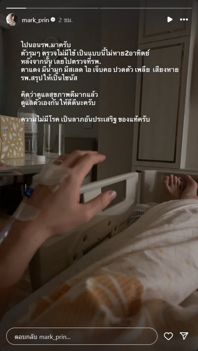 เรียกได้ว่าเป็นอีกหนึ่งพระเอกหนุ่มมากความสามารถสำหรับ หมาก ปริญ ที่ล่าสุดเจ้าตัวได้แอดมิทจนต้องไปนอนโรงพยาบาล เนื่องจากป่วยเป็นไซนัส ทั้งนี้ยังได้โพสต์ภาพขณะนอนอยู่ที่โรงพยาบาล พร้อมเขียนเล่าอาการผ่านทางสตอรี่อินสตาแกรม mark_prin ระบุว่า