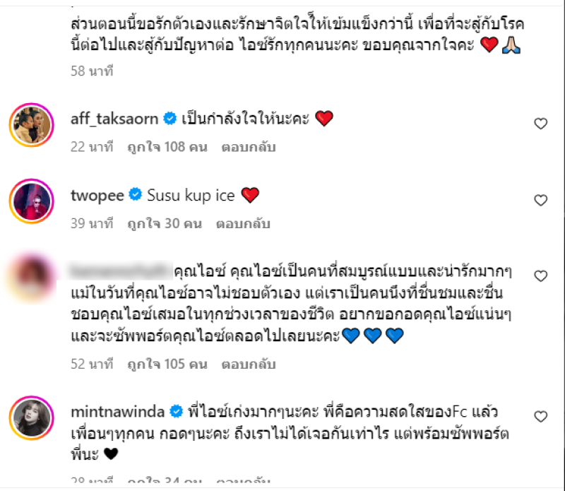 ล่าสุด ไอซ์ได้อัปเดตแล้วผ่านทางอินสตาแกรม พร้อมระบุข้อความว่า ขอบคุณทุกๆคนที่เป็นห่วงไอซ์ ขอโทษที่ไอซ์ไม่ไหวแล้วจริงๆ