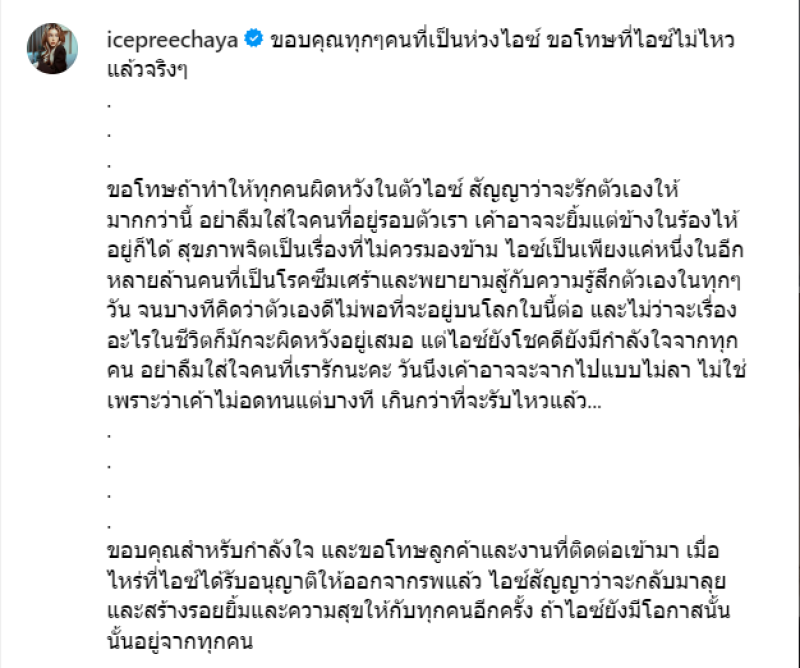 ขอโทษถ้าทำให้ทุกคนผิดหวังในตัวไอซ์ สัญญาว่าจะรักตัวเองให้มากกว่านี้ อย่าลืมใส่ใจคนที่อยู่รอบตัวเรา เค้าอาจจะยิ้มแต่ข้างในร้องไห้อยู่ก็ได้ สุขภาพจิตเป็นเรื่องที่ไม่ควรมองข้าม ไอซ์เป็นเพียงแค่หนึ่งในอีกหลายล้านคนที่เป็นโรคซึมเศร้าและพยายามสู้กับความรู้สึกตัวเองในทุกๆ วัน จนบางทีคิดว่าตัวเองดีไม่พอที่จะอยู่บนโลกใบนี้ต่อ และไม่ว่าจะเรื่องอะไรในชีวิตก็มักจะผิดหวังอยู่เสมอ แต่ไอซ์ยังโชคดียังมีกำลังใจจากทุกคน อย่าลืมใส่ใจคนที่เรารักนะคะ วันนึงเค้าอาจจะจากไปแบบไม่ลา ไม่ใช่เพราะว่าเค้าไม่อดทนแต่บางที เกินกว่าที่จะรับไหวแล้ว