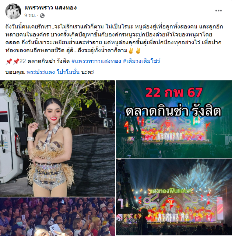 ล่าสุด แพรวพราว แสงทอง ได้เดินหน้าทำงานต่อไป พร้อมโพสต์ว่า ถึงวันนี้คนเคยรักเรา..จะไม่รักเราแล้วก็ตาม ไม่เป็นไรนะ หนูต้องสู้เพื่อลูกทั้งสองคน และลูกอีกหลายคนในองค์กร บางครั้งเกิดปัญหาขึ้นกับองค์กรหนูจะปกป้องด้วยหัวใจของหนูมาโดยตลอด ถึงวันนี้เขาจะเหยียบย่ำและทำลาย แต่หนูต้องลุกขึ้นสู้เพื่อปกป้องทุกอย่างไว้ เพื่อปากท้องของคนอีกหลายชีวิต สู้สิ…ถึงจะสู้ทั้งน้ำตาก็ตาม 22 ตลาดกินซ่า รังสิต #แพรวพราวแสงทอง #เต็มวงเต็มโชว์ ขอบคุณ พระประแดง โปรโมชั่น นะคะ