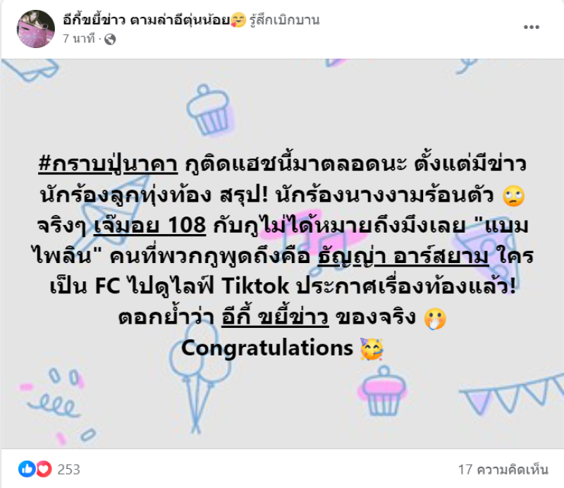 ล่าสุด ทางเพจดัง อีกี้ขยี้ข่าว ตามล่าอีตุ่นน้อย ได้ออกมาเผยแล้ว และทางธัญญ่าเองก็ประกาศว่ากำลังตั้งท้องอยู่ด้วยในงานหมั้น ยินดีคูณ2ไปเลยจ้า