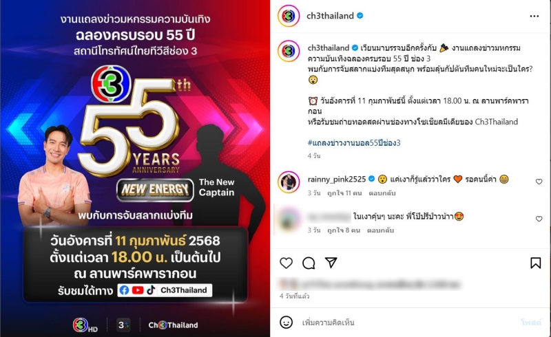 เรียกได้ว่า กลับมาอีกครั้ง สําหรับงานฉลองครบรอบประจําปีของทางช่อง 3 โดยจะมีการแตะ ฟุตบอล รวมไปถึงโชว์สุดประทับใจของศิลปินดารามากมาย โดยจะมีการแถลงข่าวมหกรรมความบันเทิงฉลองครบรอบ 55 ปีในวันที่ 11 ก.พ. นี้ พบกับ การจับสลากแบ่งทีมสุดสนุกพร้อมลุ้นกัปตันทีมคนใหม่จะเป็นใคร ซึ่งคนแรกที่ปล่อยออก มาคือพระเอกหนุ่ม เกรท วรินทร ส่วนอีกคนคาดว่าเป็นพระเอกชื่อดัง โป๊ป ธนวรรธน์ วรรธนะภูติ