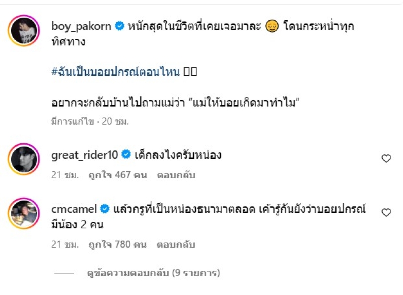เรียกได้ว่า เป็นพระเอกตัวท็อปของช่องเลยก็ว่าได้ สำหรับ บอย ปกรณ์ ที่มักจะออกมาแชร์ เวลามีคนหรือแฟนๆต่างเรียกชื่อผิด ตลกๆให้ชาวเน็ตได้ขำกัน ล่าสุด เอาอีกแล้ว เมื่อ บอย ปกรณ์ ได้ออกมาแชร์เหตุการณ์ที่ตนกำลังจะไปซื้อของ ผ่าทางอินสตาแกรม พร้อมระบุแคปชั่นว่า หนักสุดในชีวิตที่เคยเจอมาละ โดนกระหน่ำทุกทิศทาง #ฉันเป็นบอยปกรณ์ตอนไหน อยากจะกลับบ้านไปถามแม่ว่า “แม่ให้บอยเกิดมาทำไม”