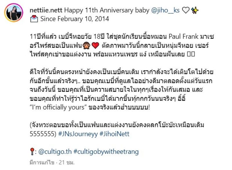 Happy 11th Anniversary baby @jiho__ks Since February 10, 2014 11ปีที่แล้ว เบบี๋จีหอยวัย 18ปี ใส่ชุดนักเรียนซื้อหมอน Paul Frank มาเซอร์ไพร์สขอเป็นแฟน ตัดภาพมาวันนี้กลายเป็นหนุ่มจีหอย เซอร์ไพร์สคุกเข่าขอแต่งงาน พร้อมแหวนเพชร แง้ เหมือนฝันเลย