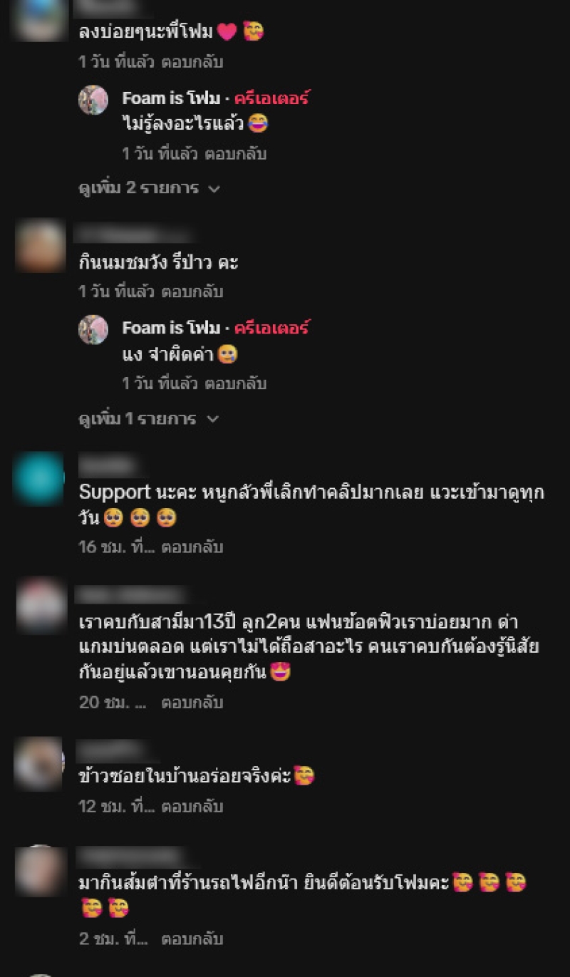 ท่ามกลางชาวเน็ตต่างเข้ามาคอมเมนต์ให้กำลังใจอีกด้วย อาทิ แม่อย่าไปสนใจคอมเม้นแย่ๆนะคะ บางคนไม่ได้ดูตั้งแต่แรก แต่มาตัดสินคลิปที่ไม่ถึง 5 นาทีด้วยซ้ำ งงมากคนที่มาว่าแม่ รู้จักแม่ดีแค่ไหนถึงมาว่า,สู้ๆ อย่าอ่านคอมเม้นลบๆนะคะ เป็นตัวของตัวเองเป็นเรื่องที่ดีค่ะ อย่าแคร์ชาวเน็ตเยอะ,เราว่าโฟมน่ารักนะ เห็นดราม่าละเพลียแทน เป็นกำลังใจให้คุณโฟมนะคะ เป็นต้น