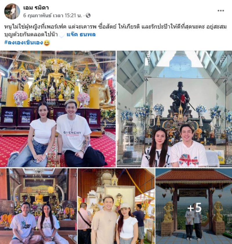และเมื่อไม่กี่วัน เอม รมิดา ลูกทุ่งสาว ก็โพสต์ภาพไปทำบุญไหว้พระกับ แจ๊ค ในที่ต่างๆ หลายแห่ง พร้อมข้อความด้วยว่า หนูไม่ใช่ผู้หญิงที่เพอร์เฟ็กต์ แต่จะเคารพ ซื่อสัตย์ ให้เกียรติ และรักปะป๊าให้ดีที่สุดนะคะ อยู่สะสมบุญด้วยกันตลอดไปน๊า แจ๊ค ธนพล #ลงเองเขินเอง