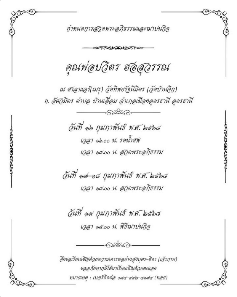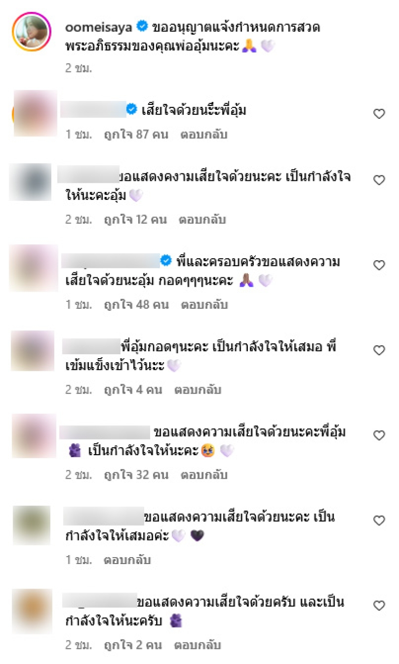 ล่าสุด อุ้ม ได้ออกมาแจ้งข่าวเศร้าผ่านทางอินสตาแกรมส่วนตัว oomeisaya ระบุว่า ขออนุญาตแจ้งกำหนดการสวดพระอภิธรรมของคุณพ่ออุ้มนะคะ ท่ามกลางเพื่อนในวงการเเละแฟนคลับต่างร่วมแสดงความเสียใจกันอย่างมาก