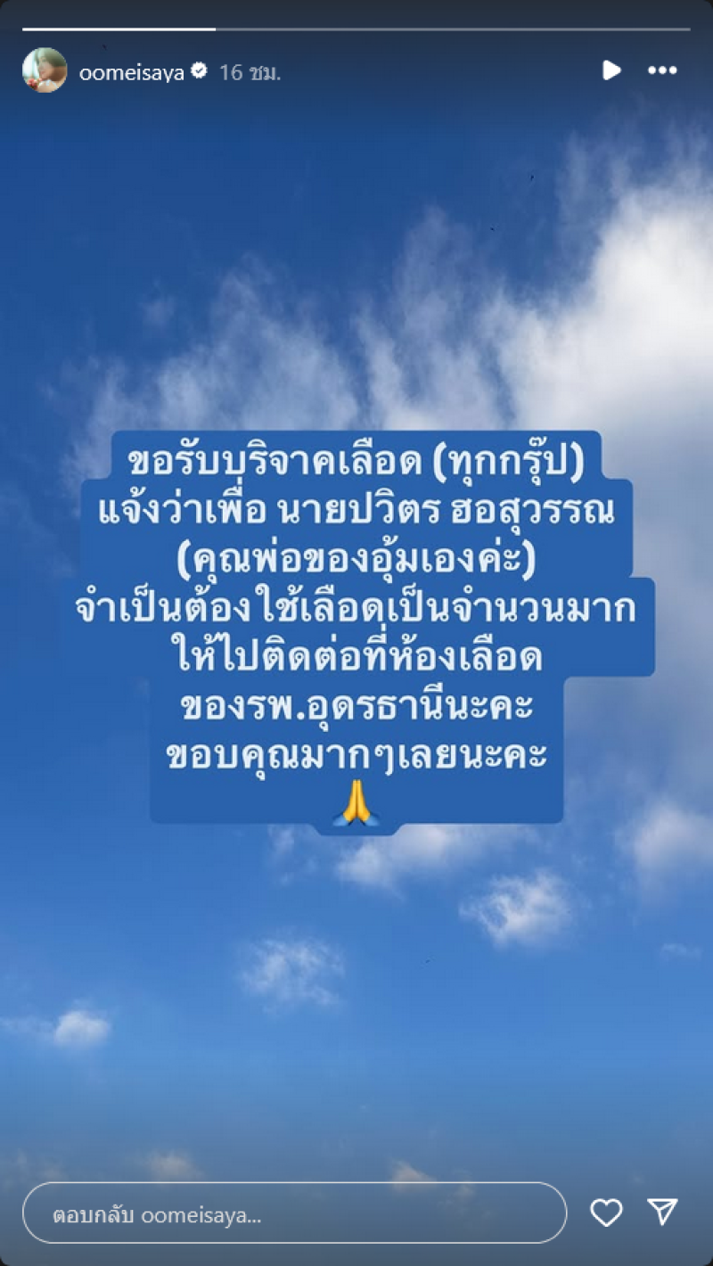 จากกรณีที่ก่อนหน้านี้ทางด้านนางเอกสาว อุ้ม อิษยา ฮอสุวรรณ ได้ออกมาโพสต์ขอความช่วยเหลือขอรับบริจาคเลือดให้คุณพ่อ เมื่อช่วงต้นเดือนกุมภาพันธ์ที่ผ่านมา ท่ามกลางคนในวงการเเละเเฟนๆต่างส่งกำลังใจ