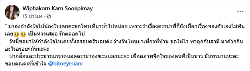 พร้อมเขียนข้อความว่า มาส่งกำลังใจให้น้องใบเตยคะขอโทษที่มาช้าไปหน่อย เพราะว่าเรื่องดราม่าพี่ก็ยังเผือกเรื่องของตัวเองไม่ทันเลย เป็นห่วงเสมอ รักตลอดไป วันนี้ขอมาให้กำลังใจใบเตยทั้งครอบครัวเลยค่ะ ว่างวันไหนมาเที่ยวที่บ้าน ขอให้ไว พาลูกกับสามี มาด้วยกินอะไรอร่อยๆกันนะคะ ฝากสื่อและประชาชนทุกคนลดดราม่าลงซะหน่อยนะคะ เพื่อสภาพจิตใจของคนที่เป็นข่าว มันทรมานนะคะ ขอบคุณค่ะที่เข้าใจ