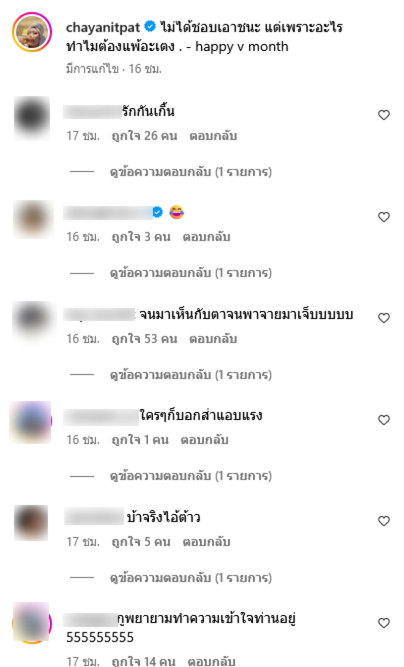 พร้อมเขียนแคปชั่นว่า ไม่ได้ชอบเอาชนะ แต่เพราะอะไรทำไมต้องแพ้อะเตง . - happy v month ท่ามกลางแฟนๆต่างเข้ามาคอมเมนต์แซวเเละอกหักกันไปตามๆกันเลยทีเดียว อาทิ จนมาเห็นกับตาจนพาใจมาเจ็บ,แพ้เหมือนกันงับ แพ้ใจให้พี่แพต,ตัดขาไปข้างเลยเพ่,หวานฉ่ำาา แฮปปี้ๆงับ เป็นต้น