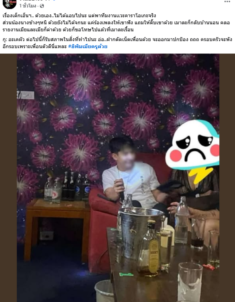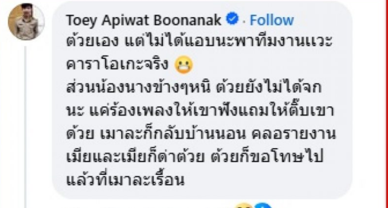 ล่าสุด เจ๊มอย108 V1 ได้ออกมาโพสต์ภาพ คล้ายฝ่ายชาย โดยระบุว่า เรื่องเด็กเอ็นฯ.. ต้วยเอง..ไม่ได้แอบไปนะ แต่พาทีมงานเเวะคาราโอเกะจริง ส่วนน้องนางข้างๆหนิ ต้วยยังไม่ได้จกนะ แค่ร้องเพลงให้เขาฟัง แถมให้ติ๊บเขาด้วย เมาละก็กลับบ้านนอน คลอรายงานเมียและเมียก็ด่าต้วย ต้วยก็ขอโทษไปแล้วที่เมาละเรื้อน