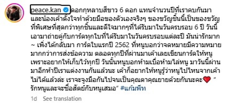 โดยล่าสุด เนื่องในโอกาสดีๆ อย่างวันครบรอบ 6 ปีของทั้งคู่ ด้านสาวแก้มบุ๋ม ได้คิดไอเดียมอบของขวัญชิ้นพิเศษ ที่ตนตั้งใจทำเองกับมือให้กับสามี ซึ่งด้านหนุ่มพีท จึงได้ลงภาพของขวัญพร้อมแคปชั่นสุดซึ้งของขวัญครบรอบเหล่านี้ ในทำนองว่า ดอกกุหลายสีขาว 6 ดอก แทนจำนวนปีที่เราคบกันมา และน้องเค้าตั้งใจด้วยมือของตัวเองจริงๆ ของขวัญชิ้นนี้พิเศษที่สุดกว่าทุกชิ้นและดีใจมากๆได้รับมาในวันครบรอบ 6 ปี เรียกได้ว่าทำเอาแฟนๆต่างพากันฟินกับความรักและความอบอุ่นของทั้งที่มีให้ต่อกันรัวๆกันเลยทีเดียว