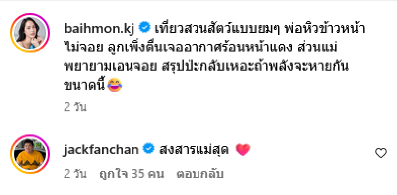พร้อมเขียนแคปชั่นว่า เที่ยวสวนสัตว์แบบยมๆ พ่อหิวข้าวหน้าไม่จอย ลูกเพิ่งตื่นเจออากาศร้อนหน้าแดง ส่วนแม่พยายามเอนจอย สรุป ป่ะกลับเหอะถ้าพลังจะหายกันขนาดนี้ แต่ทั้งนี้ก็ไม่วายมีดราม่าโดนชาวเน็ตต่างคอมเมนต์ว่า มือพ่อเอาไว้ทำอะไร อย่างน้อยถือร่มไหม,แจ็คเดินตัวปลิวเลยนะ เป็นต้น