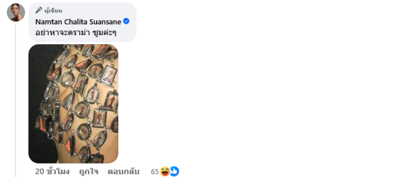 พร้อมเขียนแคปชั่นว่า สาธุ99 ซีซั่นนี้ผีดุเลยต้องพกพระมาด้วยคืนนี้เจอกัน!! #นางร้ายไทยแลนด์ss2 #queenmasternamtan ทั้งนี้ยังได้คอมเมนต์ใต้โพสต์เพิ่มเติมอีกว่า อย่าหาจะดราม่า ซูมค่ะๆ ท่ามกลางแฟนๆต่างคอมเมนต์ชื่นชม แต่ก็ไม่วายมีดราม่า