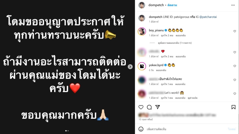 จากกรณีที่ก่อนหน้านั้น ทาง โดม เดอะเฟซ หรือ โดม เพชรธำรงชัย นายแบบ-นักแสดงหนุ่ม ที่เคยออกมาโพสต์ผ่านทางอินสตาแกรม ว่า โดมขออนุญาตประกาศให้ ทุกท่านทราบนะครับ ถ้ามีงานอะไรสามารถติดต่อ ผ่านคุณแม่ของโดมได้นะ ครบ ขอบคุณมากครับ A