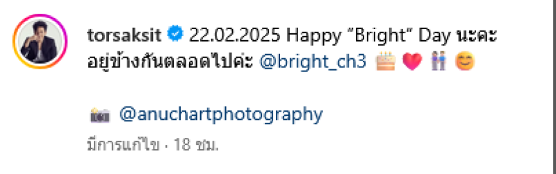 เรียกได้ว่าเป็นอีกหนึ่งคู่รักสำหรับ โต๋ ศักดิ์สิทธิ์ และ ไบรท์ พิชญทัฬห์ ที่ทั้งแฟนๆและครอบครัวต่างลุ้นเรื่องทายาทว่าเมื่อไหร่จะมีข่าวดี ล่าสุดทางด้าน โต๋ ได้โพสต์ภาพอวยพรวันเกิด ไบรท์ ผ่านทางอินสตาแกรม torsaksit พร้อมทั้งเขียนแคปชั่นว่า 22.02.2025 Happy Bright Day นะคะ อยู่ข้างกันตลอดไปค่ะ