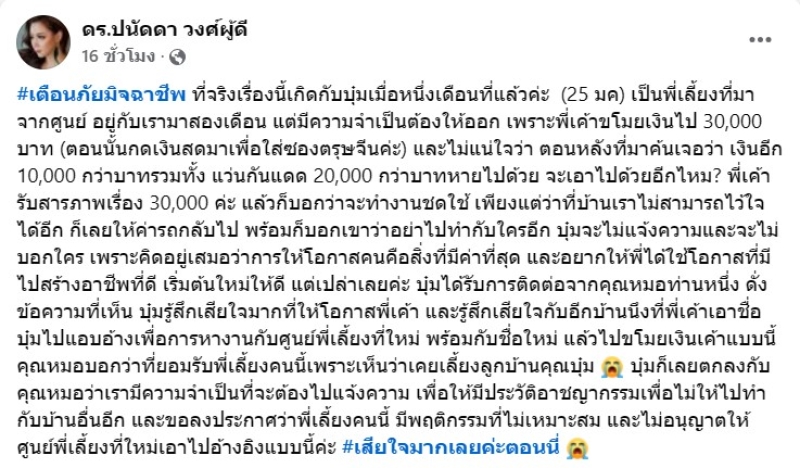 เรียกได้ว่า เดือดอย่างมาก สำหรับ บุ๋ม ปนัดดา วงศ์ผู้ดี ที่ได้ออกมาโพสต์เตือน ภัยมิจฉาชีพ ที่จริงเรื่องนี้เกิดกับบุ๋มเมื่อหนึ่งเดือนที่แล้วค่ะ (25 มค) เป็นพี่เลี้ยงที่มาจากศูนย์ อยู่กับเรามาสองเดือน แต่มีความจำเป็นต้องให้ออก เพราะพี่เค้าขโมยเงินไป 30,000 บาท (ตอนนั้นกดเงินสดมาเพื่อใส่ซองตรุษจีนค่ะ) และไม่แน่ใจว่า ตอนหลังที่มาค้นเจอว่า เงินอีก 10,000 กว่าบาทรวมทั้ง แว่นกันแดด 20,000 กว่าบาทหายไปด้วย จะเอาไปด้วยอีกไหม?