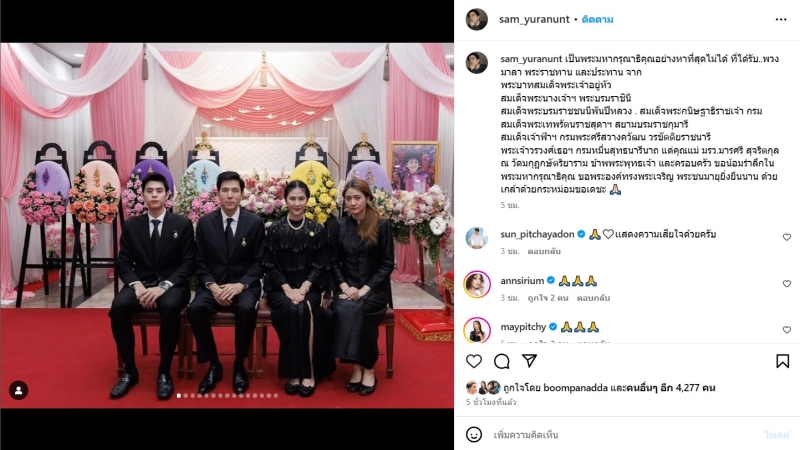 จากกรณีที่ก่อนหน้านั้น หม่อมราชวงศ์ มารศรี สุจริตกุล ซึ่งเป็นคุณแม่ของ มุก มาริษา ภรรยา ที่จากไปอย่างสงบในวัย 90 ปี โดยล่าสุด แซม ยุรนันท์ ในฐานะลูกเขย ได้ออกมาโพสต์ครั้งแรก หลังถูกปล่อยตัว อาลัยคุณแม่ภรรยาว่า เป็นพระมหากรุณาธิคุณอย่างหาที่สุดไม่ได้ ที่ได้รับ..พวงมาลา พระราชทาน และประทาน จาก พระบาทสมเด็จพระเจ้าอยู่หัว สมเด็จพระนางเจ้าฯ พระบรมราชินี สมเด็จพระบรมราชชนนีพันปีหลวง . สมเด็จพระกนิษฐาธิราชเจ้า กรมสมเด็จพระเทพรัตนราชสุดาฯ สยามบรมราชกุมารี สมเด็จเจ้าฟ้าฯ กรมพระศรีสวางควัฒน วรขัตติยราชนารี พระเจ้าวรวงศ์เธอฯ กรมหมื่นสุทธนารีนาถ แด่คุณแม่ มรว.มารศรี สุจริตกุล ณ วัดมกุฏกษัตริยาราม ข้าพพระพุทธเจ้า และครอบครัว ขอน้อมรำลึกในพระมหากรุณาธิคุณ ขอพระองค์ทรงพระเจริญ พระชนมายุยิ่งยืนนาน ด้วยเกล้าด้วยกระหม่อมขอเดชะ