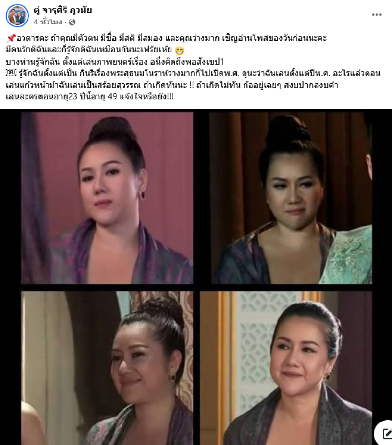 รู้จักฉันตั้งแต่เป็นกินรีเรื่องพระสุธนมโนราห์ว่างมากก็ไปเปิดพ.ศ. ดูนะว่าฉันเล่นตั้งแต่ปีพ.ศ. อะไรแล้วตอนเล่นแก้วหน้าม้าฉันเล่นเป็นสร้อยสุวรรณ ถ้าเกิดทันนะ ถ้าเกิดไม่ทัน ก้ออยู่เฉยๆ สงบปากสงบคำ เล่นละครตอนอายุ23 ปีนี้อายุ 49 แจ้งใจหรือยัง!!!