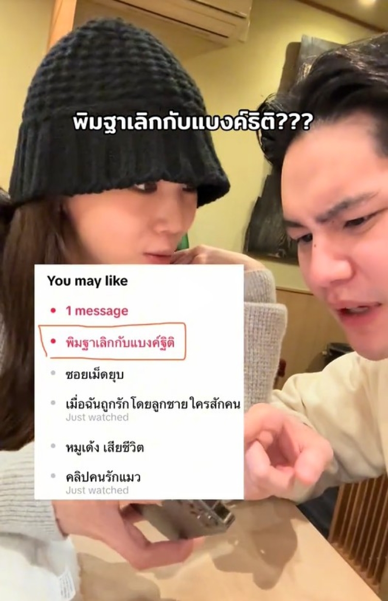 พร้อมเขียนแคปชั่นว่า สะดุ้งทุกทีที่เข้าหน้า search ใน tiktok โดยทางด้านคนสนิทได้เผยคลิปขณะนั่งทานอาหาร โดยแพลนกล้องไปทาง แบงค์-พิมฐา ที่กำลังกระหนุงกระหนิงหยอกล้อกันอย่างหวาน เรียกได้ว่าทำเอาสยบข่าวเลิกรากันไปเลย